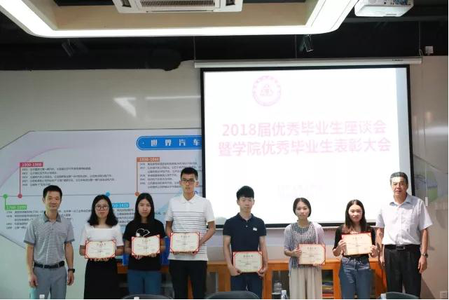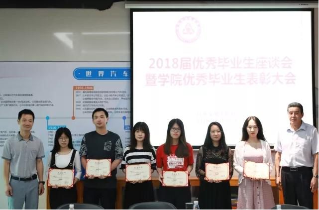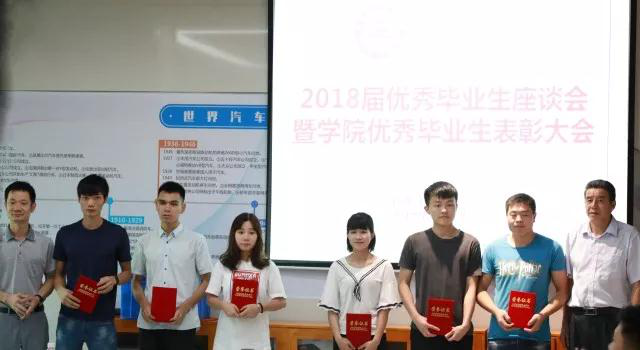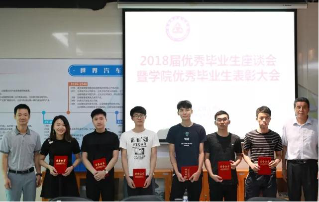 首先,罗成龙书记宣读了《汽车与交通学院2018届优秀毕业生》表彰决定,并对毕业生三年取得的成绩表示祝贺,希望毕业们戒骄戒躁,把这种刻苦认真的精神带到工作中去,争取创造更大的辉煌。 接下来,董铸荣院长希望毕业生们就大学期间在学习、社团、学生组织及生活等方面遇到的困难和问题,提出自己的意见和建议,学院会根据大家的要求作出相应的整改,为师弟师妹创造更好的成长成才环境。董铸荣院长和罗成龙书记一一为24位院级优秀毕业生颁发了荣誉证书并合影留念,毕业生脸上洋溢着灿烂的笑容。随后优秀毕业生们结合学院和自身实际竞相发言,提出对学院有关就业,社团,课程等多方面的看法与建议。他们的发言,充满了对母校的深深感激和浓浓眷恋。同时,优秀毕业生们也表达了他们将在人生新的起点上脚踏实地,为母校争光添彩的决心。